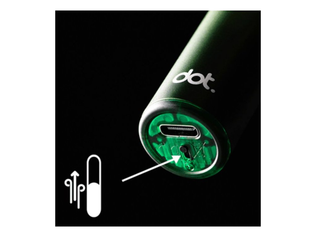 Elektronická cigareta DotMod Switch R je ideální vapovací zařízení ve stylu pera pro začátečníky, kteří hledají jednoduchost bez kompromisů v kvalitě vapingu. Tělo baterie je vyrobeno z kvalitního hliníku a disponuje vestavěným monočlánkem o kapacitě 1000mAh s rychlonabíjením typu USB-C a automatickým výkonem až 25W. Vyměnitelná cartridge (POD) je vybavena žhavící hlavou o odporu 0,8ohm s objemem nádržky 3ml. Díky magnetickému propojení s baterií lze cartridge jednoduše vyjmout a doplnit oblíbeným liquidem. Regulace přívodu vzduchu pro nastavení optimální kouřivosti se nachází ve spodní části těla baterie.