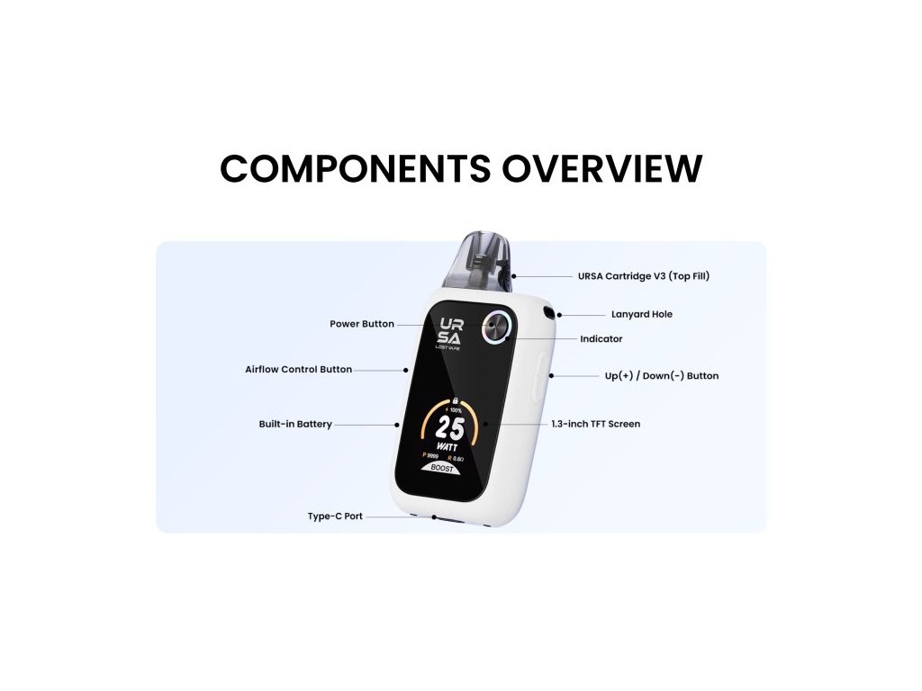Lost Vape Ursa Epoch Pro představuje modernizovanou verzi oblíbeného modelu Ursa Epoch, navrženou pro vapery, kteří hledají vyšší výkon, více možností personalizace a delší výdrž. Vestavěná 1400mAh dobíjecí baterie poskytuje dostatek energie pro celodenní vapování, přičemž výkon lze plynule nastavit od 1W do 35W pomocí dedikovaného tlačítka. Zařízení je osazeno novým Ursa V3 podem s objemem 2.5ml a horním plněním, přičemž zůstává kompatibilní s cartridgemi Ursa V1, V2 a V3. Velký 1.3" TFT barevný displej nabízí pět volitelných témat a zobrazuje všechny důležité informace v reálném čase – stav baterie, výkon, počet potahů, odpor spirálky a další. Ursa Epoch Pro si zachovává ochranný silikonový návlek, který zajišťuje pevný úchop a chrání povrch zařízení. Díky podpoře MTL i RDL stylu vapování, kombinaci spínání potahem nebo tlačítkem a elegantnímu designu se jedná o univerzální volbu pro každodenní použití.