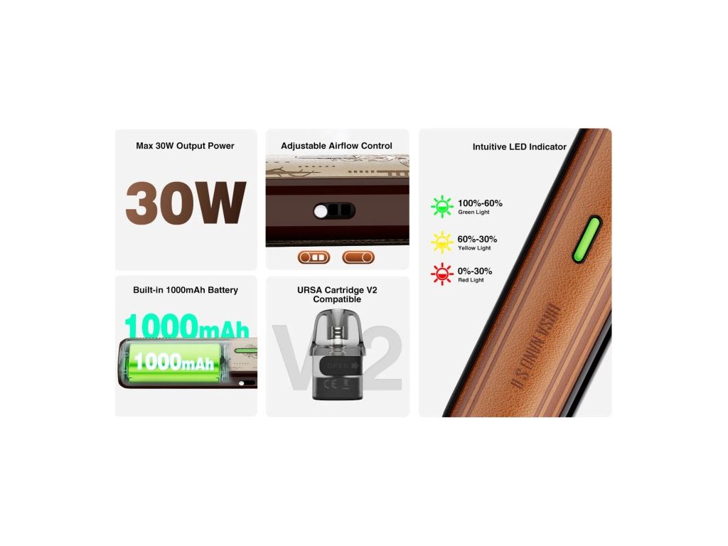 Druhá řada oblíbené elektronické cigarety Ursa Nano S II od společnosti Lost Vape. Ergonomické tělo baterie s decentním pogumováním disponuje integrovaným monočlánkem o kapacitě 1000mAh s automatickým spínačem, výstupním výkonem až 25W a USB-C portem pro rychlé nabíjení. Cartridge o objemu 2,5ml jsou plně kompatibilní s předchozími modely a v základním balení naleznete cartridge o odporu 0,8ohm.