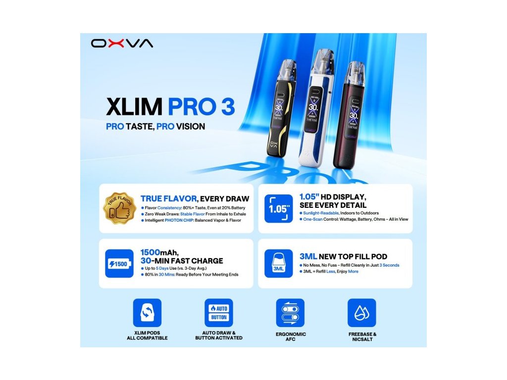 Prémiový pod systém OXVA XLIM PRO 3 navazuje na úspěšnou řadu XLIM a přináší výrazně silnější výkon, delší výdrž a modernizované uživatelské rozhraní. S novou vysokokapacitní 1500mAh baterií, turbo nabíjením přes USB-C (5V/2A) a inteligentním PHOTON čipem patří XLIM PRO 3 mezi nejpokročilejší pod systémy své třídy. Zařízení podporuje výkon až 30W a díky široké kompatibilitě cartridge XLIM V3 & XLIM EZ nabízí maximální flexibilitu pro MTL i RDL uživatele. XLIM PRO 3 je vybaven inovovanými top-fill pod cartridgemi série XLIM V3, které jsou součástí balení ve variantách 0.6Ω a 0.8Ω. Podporovány jsou také odpory 0.4Ω a 1.2Ω, což umožňuje přizpůsobit styl potahu od razantního RDL až po jemnější MTL. Unitech 2.0 multi-layer technologie uvnitř XLIM podů zajišťuje čistou, výraznou a dlouhotrvající chuť při použití nikotinových solí i klasických e-liquidů. Velký 1.05" HD barevný displej přehledně zobrazuje výkon, odpor, stav baterie a další důležité informace. Ergonomické boční airflow umožňuje velmi přesné jemné doladění průtoku vzduchu podle osobních preferencí. Tělo zařízení je vyrobeno ze zinkové slitiny a PCTG, díky čemuž je odolné, příjemné do ruky a přitom si zachovává nízkou hmotnost pouhých 77g. OXVA XLIM PRO 3 je ideální volbou pro uživatele, kteří hledají kombinaci výkonu, rychlosti, komfortu a flexibilní kompatibility podů. Díky vysoké spolehlivosti a prémiovému zpracování je vhodný jak pro začátečníky, tak pro pokročilé vapery.