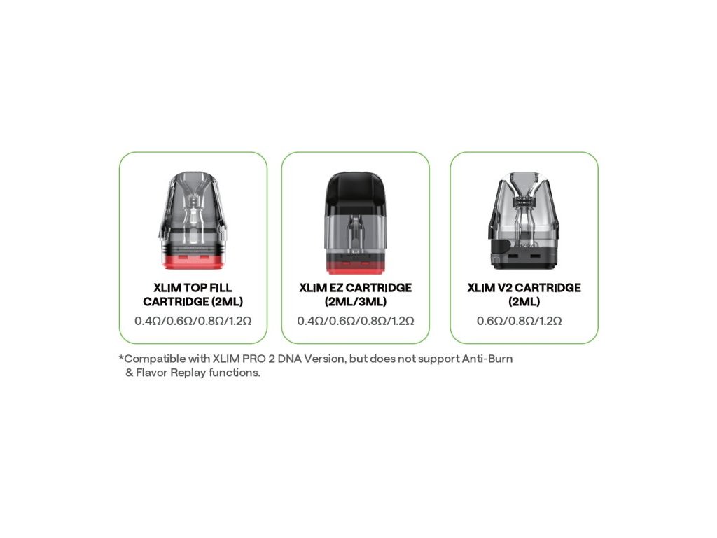 Cartridge Xlim Top Fill SS (Stainless Steel) s vrchním plněním, které pojmou až 2ml liquidu. Určené primárně pro OXVA XLIM PRO 2 DNA., ale jsou plně kompatibilní se všemi zařízeními OXVA XLIM (Xlim GO, Xlim Classic Edition, Xlim Pro, Xlim Pro 2, Xlim SQ Pro, Xlim SQ Pro 2).