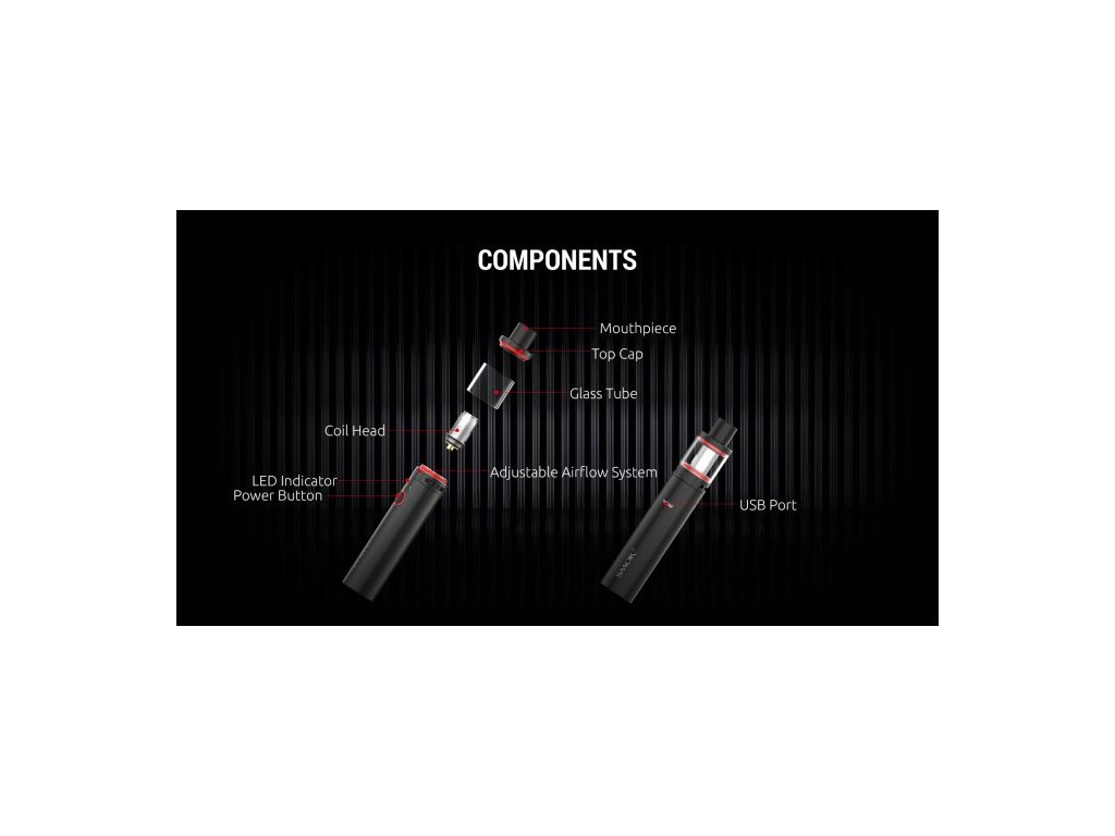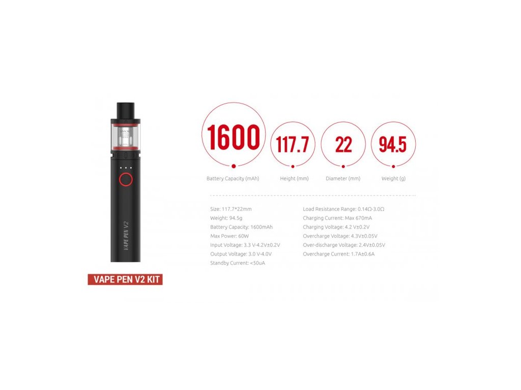 Elektronické cigarety Vape Pen od Smoktechu přicházejí s verzí V2, kterou si oblíbí jak zkušení uživatelé, tak i úplní začátečníci, a to díky jednoduché obsluze s automatickým výkonem až 60W (výkon je nastavován automaticky v závislosti na zvoleném odporu atomizeru). Ergonomické tělo baterie disponuje kapacitou 1600mAh, LED indikátorem stavu nabití a důmyslným vyváženým přívodem vzduchu pro dokonalou chuť liquidu a optimální kouřivost. Baterie je opatřena speciálním závitem pro clearomizer, který lze jednoduše odšroubovat a vyměnit žhavicí hlavu řady Vape Pen. Používá systém horního plnění - po odšroubování vrchní části plníte liquid přímo do těla nádržky o objemu 3ml. Boční přívod vzduchu zajišťuje velkou tvorbu páry. Mezi její další přednosti patří ochrana proti zkratu a přehřátí, nízkému odporu a 8-mi vteřinová ochrana žhavení.