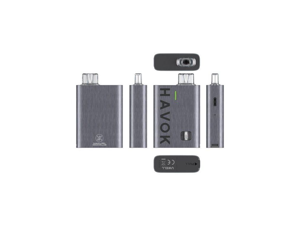 Elektronická cigareta Uwell Havok R se vyznačuje svým neotřelým designem a hlavně inovativní instalací cartridge, která se vkládá zespodu těla baterie = zamezení protečení liquidu. Vestavěný monočlánek o kapacitě 950mAh s automickým výkonem až 22W, LED indikátor stavu nabití a USB-C port pro rychlé nabití. Cartridge Havok R o objemu 3ml disponuje integrovanou žhavicí cívkou o odporu 0,6ohm.