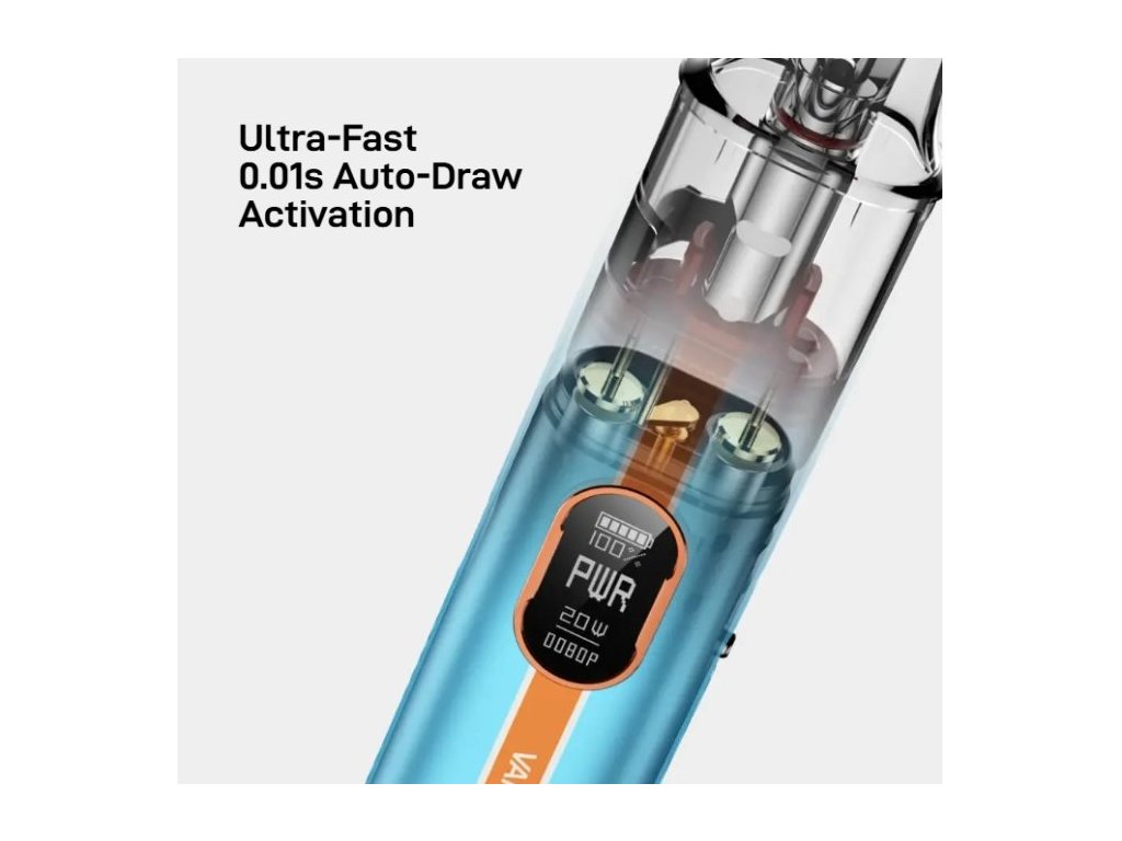 Vaporesso Vibe Pod Kit. Novinka zaujme nejen moderním vzhledem, ale především inovativní technologií Dual Mesh Coil, která přináší plnější chuť liquidu a delší životnost cartridge. Tělo baterie je vyrobeno z lehkého a odolného materiálu, který v sobě ukrývá monočlánek o kapacitě 1100mAh s rychlým USB-C nabíjením (5V/2A) a výkonným čipem AXON. Ten umožňuje přepínání mezi režimy ECO (úsporný výkon) a PWR (plný výkon), přičemž zařízení zároveň umožňuje regulaci airflow a přizpůsobení potahu od utaženého po volný. Na přední straně baterie se nachází praktické spínací tlačítko a barevný 0,54" TFT displej, který informuje o stavu baterie i aktuálním režimu. Vyměnitelná cartridge o objemu 4,5ml je navržena pro maximální výdrž.
