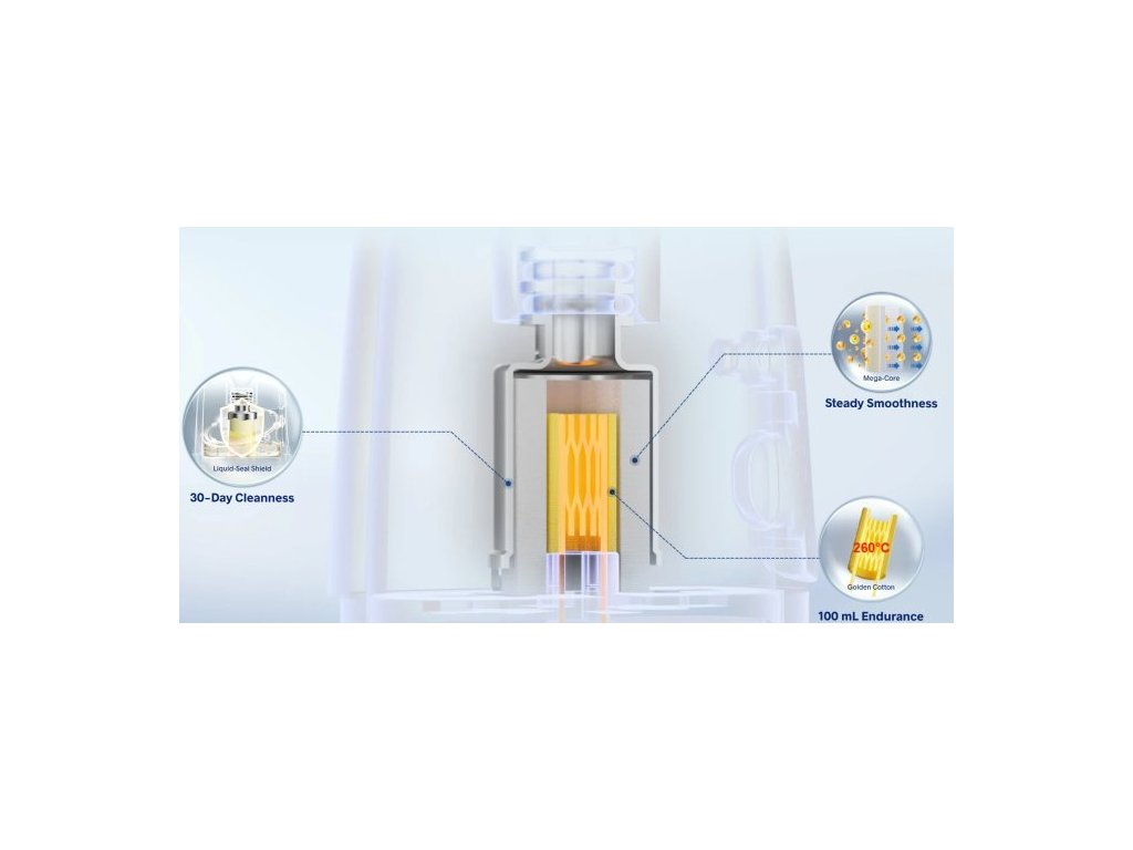 ARGUS Top Fill V2, která využívá nejnovější technologii iCOSM 2.0. Tato inovace přináší tři klíčové výhody: 30denní čistotu, stabilní a hladký projev a výdrž až 100 ml e-liquidu. Naše vlastní měděná komora vytváří e-liquidový film, který pokrývá 99 % vaty a udržuje stálý tlak vzduchu. Tento film je 3× hustší než u běžných konstrukcí, což zvyšuje odolnost proti protékání o 83 % a zajišťuje bezproblémový provoz i v náročných podmínkách. Bez protékání. Bez nepořádku. Čisté potěšení. Kompatibilní s celou řadou zařízení ARGUS.