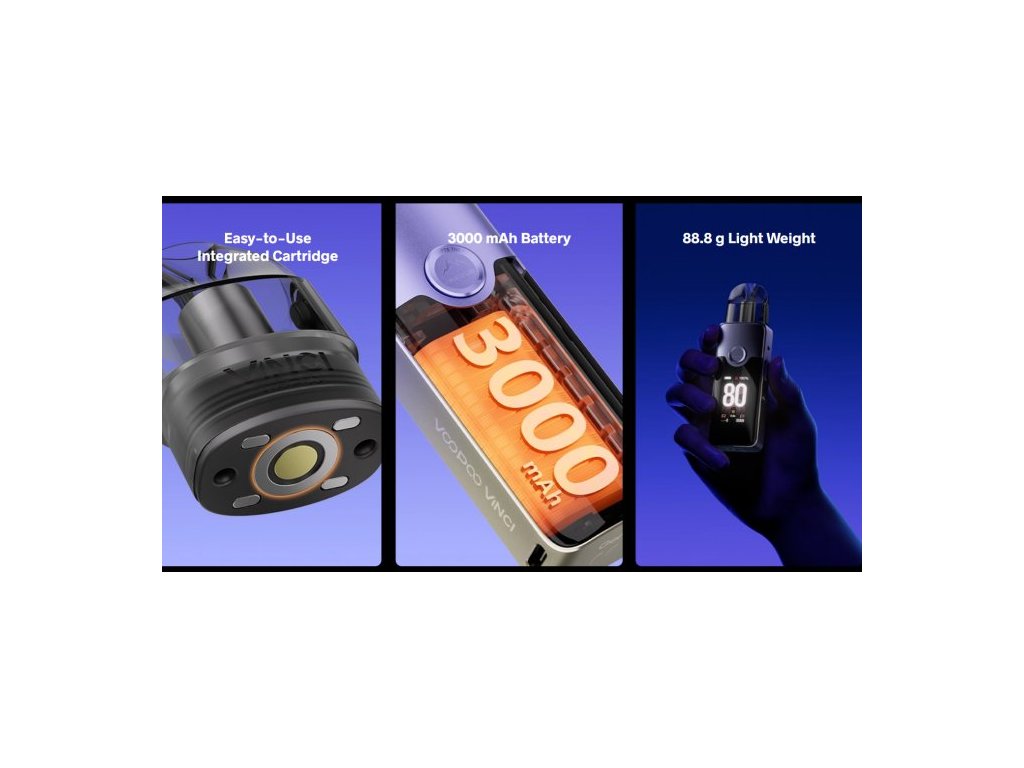 Sada VOOPOO VINCI E80 kombinuje vysoký výkon s uživatelsky přívětivým designem, díky čemuž je ideální jak pro úplné začátečníky, tak i zkušené vapery. Díky masivní vestavěné baterii o kapacitě 3000mAh poskytuje zařízení až 80W nastavitelného výkonu pro optimální zážitek z DTL na MTL vapování. Nová cartridge VINCI E o objemu 5ml je k dispozici s variantami odporu 0,3/0,6 a 0,8ohmu, což umožňuje bohatou chuť a flexibilitu páry. E80 je vyrobena z odolné hliníkové slitiny a vybavena TFT 1,47palcovým displejem, takže vyvažuje funkčnost s přenosností.